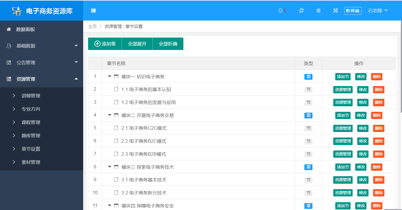 教師(shi)端的(de)基礎數據(ju)(ju)包括數據(ju)(ju)看板,基礎數據(ju)(ju),公告管理(li),資源管理(li)。數據(ju)(ju)統(tong)(tong)計(ji)(ji)(ji)包括班級(ji)統(tong)(tong)計(ji)(ji)(ji),學生統(tong)(tong)計(ji)(ji)(ji),專(zhuan)業(ye)方向,課程(cheng)統(tong)(tong)計(ji)(ji)(ji),講師(shi)統(tong)(tong)計(ji)(ji)(ji),素材統(tong)(tong)計(ji)(ji)(ji),報表統(tong)(tong)計(ji)(ji)(ji)等。