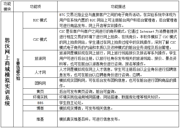 思沃網上商(shang)城(cheng)模擬實(shi)(shi)訓(xun)系統充分考慮到了(le)試驗的(de)具體(ti)情況,系統針(zhen)對網上商(shang)城(cheng)模擬實(shi)(shi)訓(xun)進(jin)行相關配置(zhi),學生可在系統中體(ti)驗網上B2C、C2C模擬商(shang)城(cheng)開(kai)店實(shi)(shi)訓(xun)并結合網絡環境的(de)搭(da)建、數據(ju)庫運用知識、團購網、在線旅游網、在線人(ren)才網等(deng)進(jin)行多元性的(de)實(shi)(shi)訓(xun)系統。