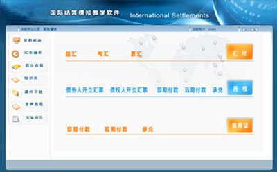《思沃(wo)國際(ji)結算模擬實訓系統》從(cong)高校國際(ji)結算教(jiao)學的(de)實際(ji)需求(qiu)出(chu)發,主要從(cong)匯付(fu)、托(tuo)收、信用證三種不同類(lei)型(xing)的(de)結算方(fang)式,本教(jiao)學平臺(tai)軟件逼(bi)真地模擬了(le)出(chu)口商、進口商、匯入(ru)行、匯出(chu)行等角色(se)的(de)辦事流(liu)程。