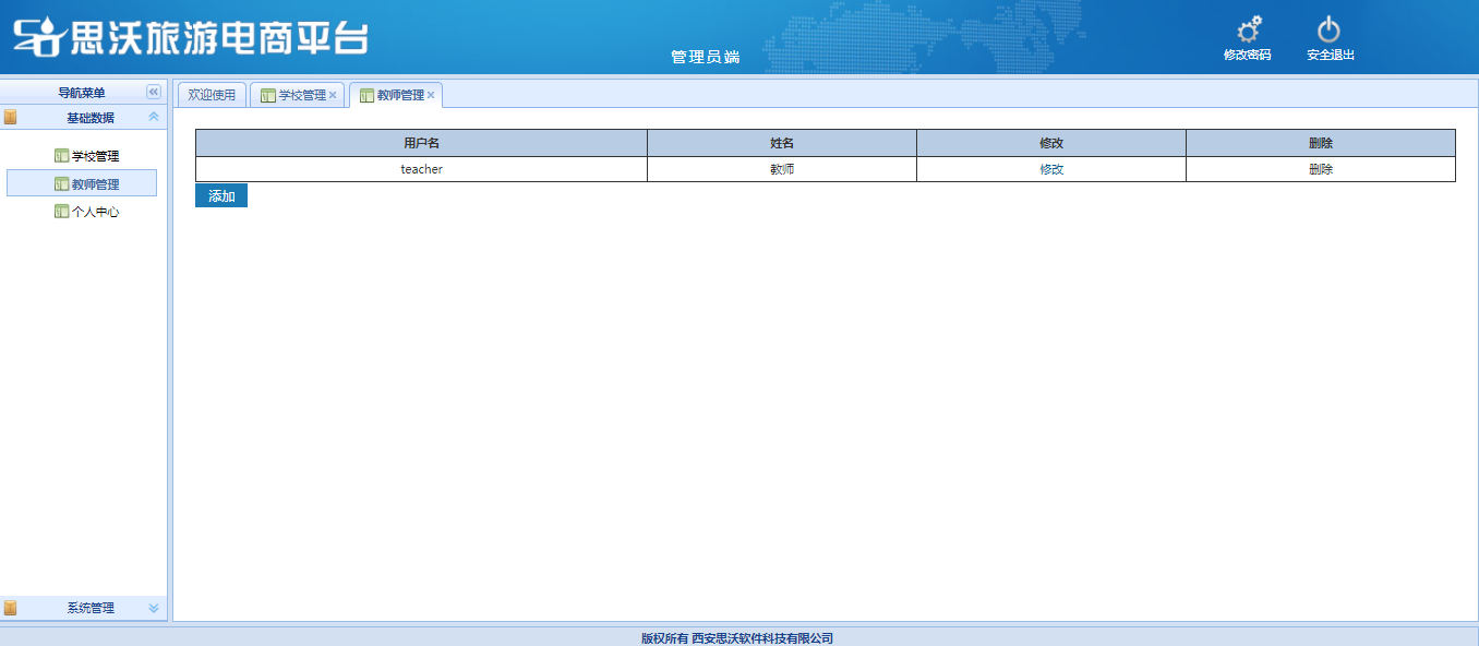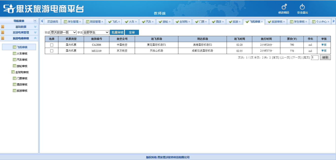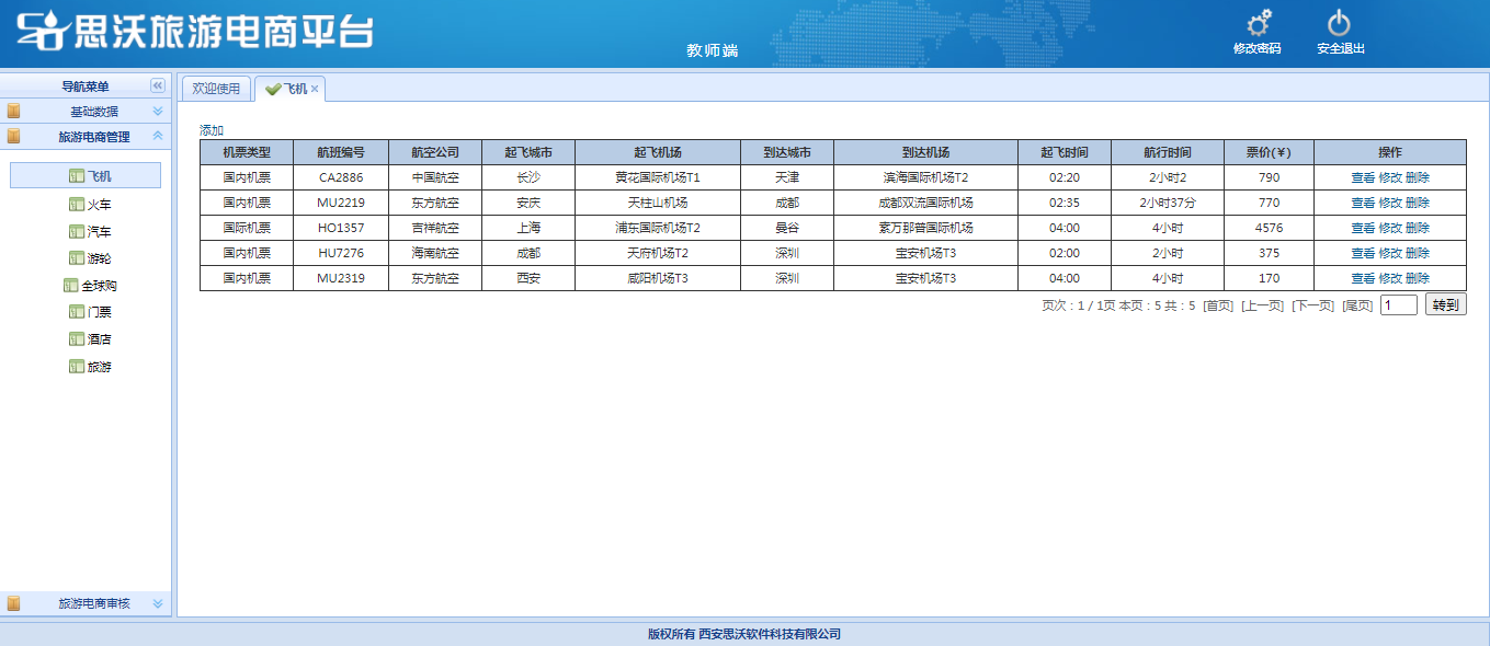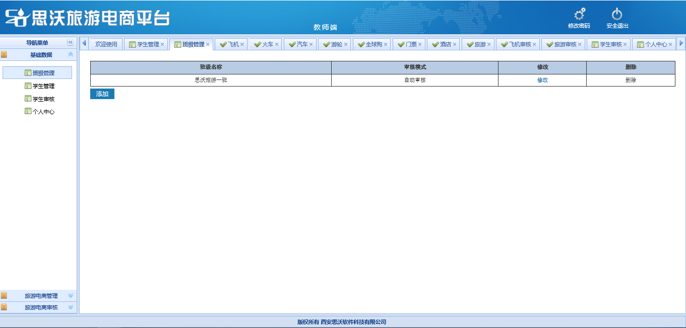 教師端包括:基礎數據(班級管(guan)(guan)理(li)(li)、學(xue)生(sheng)管(guan)(guan)理(li)(li)、學(xue)生(sheng)審核(he)(he)、個(ge)人信(xin)息);旅游(you)(you)電商管(guan)(guan)理(li)(li)(對學(xue)生(sheng)發布已審核(he)(he)的飛機、火車、汽車、游(you)(you)輪(lun)(lun)、全(quan)球購(gou)(gou)、門票、酒(jiu)店、旅游(you)(you)產品信(xin)息進行(xing)管(guan)(guan)理(li)(li));旅游(you)(you)電商審核(he)(he)(對學(xue)生(sheng)發布的飛機、火車、汽車、游(you)(you)輪(lun)(lun)、全(quan)球購(gou)(gou)、門票、酒(jiu)店、旅游(you)(you)產品信(xin)息進行(xing)進行(xing)審核(he)(he))。