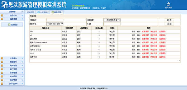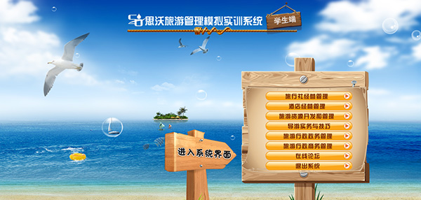 思沃旅(lv)(lv)游(you)管(guan)(guan)理(li)(li)(li)(li)模(mo)擬(ni)實訓系統(tong)分(fen)(fen)為(wei)模(mo)擬(ni)操作(zuo)和(he)旅(lv)(lv)游(you)知(zhi)識練習(xi)兩大(da)模(mo)塊,涵(han)蓋(gai)旅(lv)(lv)行(xing)社業的(de)(de)(de)分(fen)(fen)銷、操作(zuo)、結算、統(tong)計分(fen)(fen)析等(deng)各大(da)業務模(mo)塊,該實訓教(jiao)學(xue)(xue)平臺軟(ruan)件具(ju)備團隊計劃、旅(lv)(lv)游(you)預訂(ding)、客房預訂(ding)、機票預訂(ding)、景點門票預訂(ding)、團餐預訂(ding)、車輛(liang)預訂(ding)、收付款管(guan)(guan)理(li)(li)(li)(li)、供應商、團隊客戶(hu)、VIP散客管(guan)(guan)理(li)(li)(li)(li)等(deng)功能(neng)。從(cong)(cong)旅(lv)(lv)行(xing)社經營(ying)管(guan)(guan)理(li)(li)(li)(li)、酒店(dian)經營(ying)管(guan)(guan)理(li)(li)(li)(li)、旅(lv)(lv)游(you)資源開發與(yu)(yu)管(guan)(guan)理(li)(li)(li)(li)、旅(lv)(lv)游(you)行(xing)政管(guan)(guan)理(li)(li)(li)(li)、導游(you)實務與(yu)(yu)技巧五(wu)個方面讓(rang)學(xue)(xue)生(sheng)(sheng)參與(yu)(yu)旅(lv)(lv)游(you)管(guan)(guan)理(li)(li)(li)(li)的(de)(de)(de)模(mo)擬(ni)操作(zuo),每(mei)個方面又細(xi)分(fen)(fen)為(wei)實際流(liu)程中涉及的(de)(de)(de)每(mei)個細(xi)節,因此,學(xue)(xue)生(sheng)(sheng)可以從(cong)(cong)中學(xue)(xue)習(xi)到(dao)旅(lv)(lv)游(you)管(guan)(guan)理(li)(li)(li)(li)的(de)(de)(de)全面的(de)(de)(de)操作(zuo)流(liu)程。此外,軟(ruan)件中教(jiao)師端對(dui)應的(de)(de)(de)實驗設置,讓(rang)教(jiao)師可以方便地(di)為(wei)學(xue)(xue)生(sheng)(sheng)設置實驗的(de)(de)(de)不同因素,同時,教(jiao)師還可以查看(kan)學(xue)(xue)生(sheng)(sheng)的(de)(de)(de)操作(zuo)結果,從(cong)(cong)而能(neng)夠對(dui)學(xue)(xue)生(sheng)(sheng)的(de)(de)(de)實驗進行(xing)評價。教(jiao)學(xue)(xue)軟(ruan)件系統(tong)的(de)(de)(de)使用可以提高(gao)學(xue)(xue)生(sheng)(sheng)的(de)(de)(de)學(xue)(xue)習(xi)興趣,同時也為(wei)教(jiao)師減輕(qing)工作(zuo)負擔。本公司(si)為(wei)了更(geng)好(hao)滿足高(gao)校的(de)(de)(de)教(jiao)學(xue)(xue)需(xu)求(qiu),會根(gen)據高(gao)校的(de)(de)(de)需(xu)求(qiu)提供旅(lv)(lv)游(you)管(guan)(guan)理(li)(li)(li)(li)實訓室解(jie)決方案。