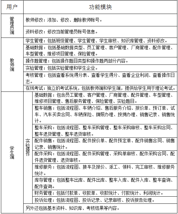 系統(tong)分為三個權限端(duan)口,管(guan)(guan)理員(yuan)端(duan)、教(jiao)師端(duan)和學生端(duan)。教(jiao)師除對(dui)學生、班級進(jin)行管(guan)(guan)理外,對(dui)實驗的管(guan)(guan)理尤為重要。不(bu)僅(jin)可以設置(zhi)實驗基礎數(shu)據,包括員(yuan)工管(guan)(guan)理、客戶(hu)管(guan)(guan)理、廠(chang)商管(guan)(guan)理、配(pei)件(jian)管(guan)(guan)理、車型(xing)管(guan)(guan)理、維(wei)修項目管(guan)(guan)理、保險管(guan)(guan)理等(deng)。還可以對(dui)實驗狀態進(jin)行控制。系統(tong)記錄(lu)學生操作得(de)分、企業利潤、操作日志等(deng),便于教(jiao)師更好的進(jin)行教(jiao)學安(an)排(pai)。