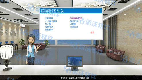 思沃文(wen)(wen)秘(mi)虛擬仿真實訓系(xi)統是我公司依據文(wen)(wen)秘(mi)專業(ye)相關課程(cheng),結合3D動態場景技術,引入(ru)實際文(wen)(wen)秘(mi)工作中(zhong)的相關案例,融合開發的一款針對文(wen)(wen)秘(mi)專業(ye)實訓的應用型教(jiao)學(xue)平臺軟(ruan)件。