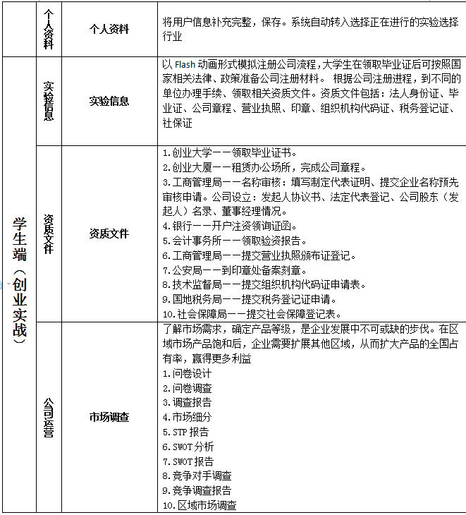 學生(sheng)端模擬現實(shi)(shi)創業的(de)步驟及相關流(liu)程進行創業實(shi)(shi)驗。