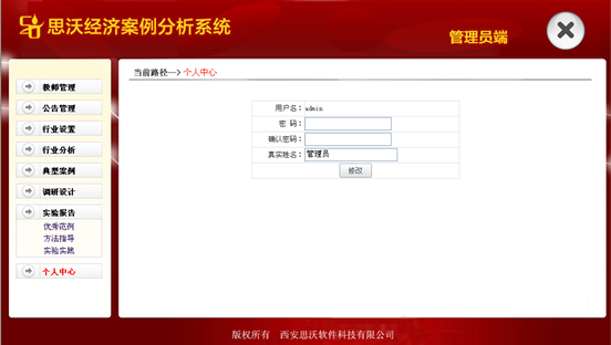 管(guan)理員端(duan)是(shi)主(zhu)要(yao)進行系(xi)統(tong)的(de)基礎數據管(guan)理和(he)設(she)(she)置(zhi)的(de),其中主(zhu)要(yao)包括教師管(guan)理、公告管(guan)理、行業設(she)(she)置(zhi)、行業分析、典型案例、調研設(she)(she)計(ji)、實驗報告、個人中心等主(zhu)要(yao)模塊。